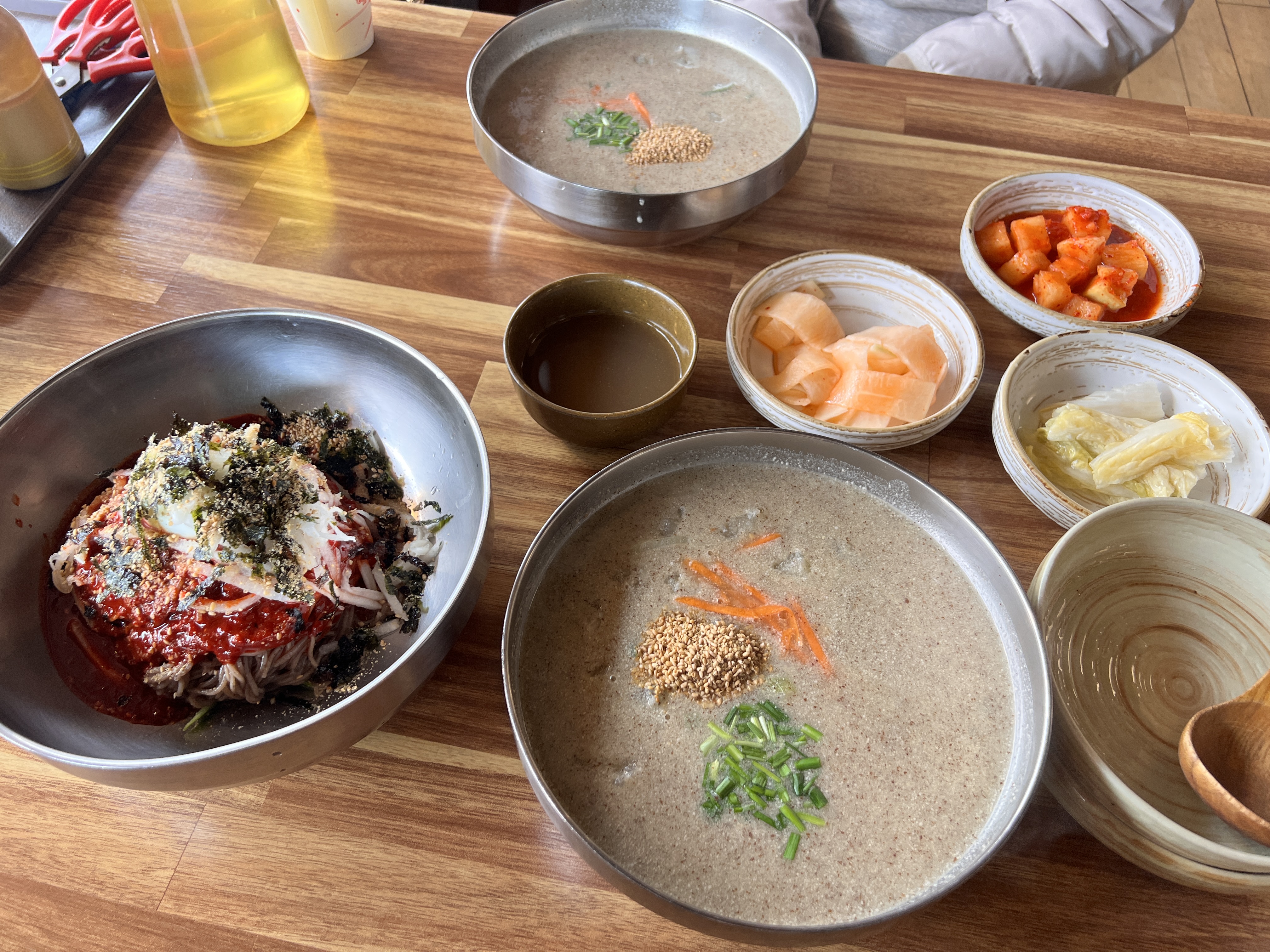 메뉴는 메밀의 매력을 제대로 느낄 수 있는 음식들로 꽉 차 있었습니다. 물막국수, 비빔막국수는 기본이고, 명태식해막국수, 들깨 옹심이, 메밀전병 등 개성 넘치는 메뉴들도 있었습니다. 무엇을 먹을지 고민되신다면 물 1, 비빔 1, 그리고 따뜻한 메뉴인 들깨 옹심이를 함께 시키는 걸 추천합니다! 전병 같은 사이드 메뉴도 정말 인기라 다들 꼭 하나씩은 시키는 모습을 볼 수 있었습니다. 그리고 메뉴 주문은 테이블마다 비치된 태블릿으로 할 수 있어 사용자 경험도 편리했습니다.