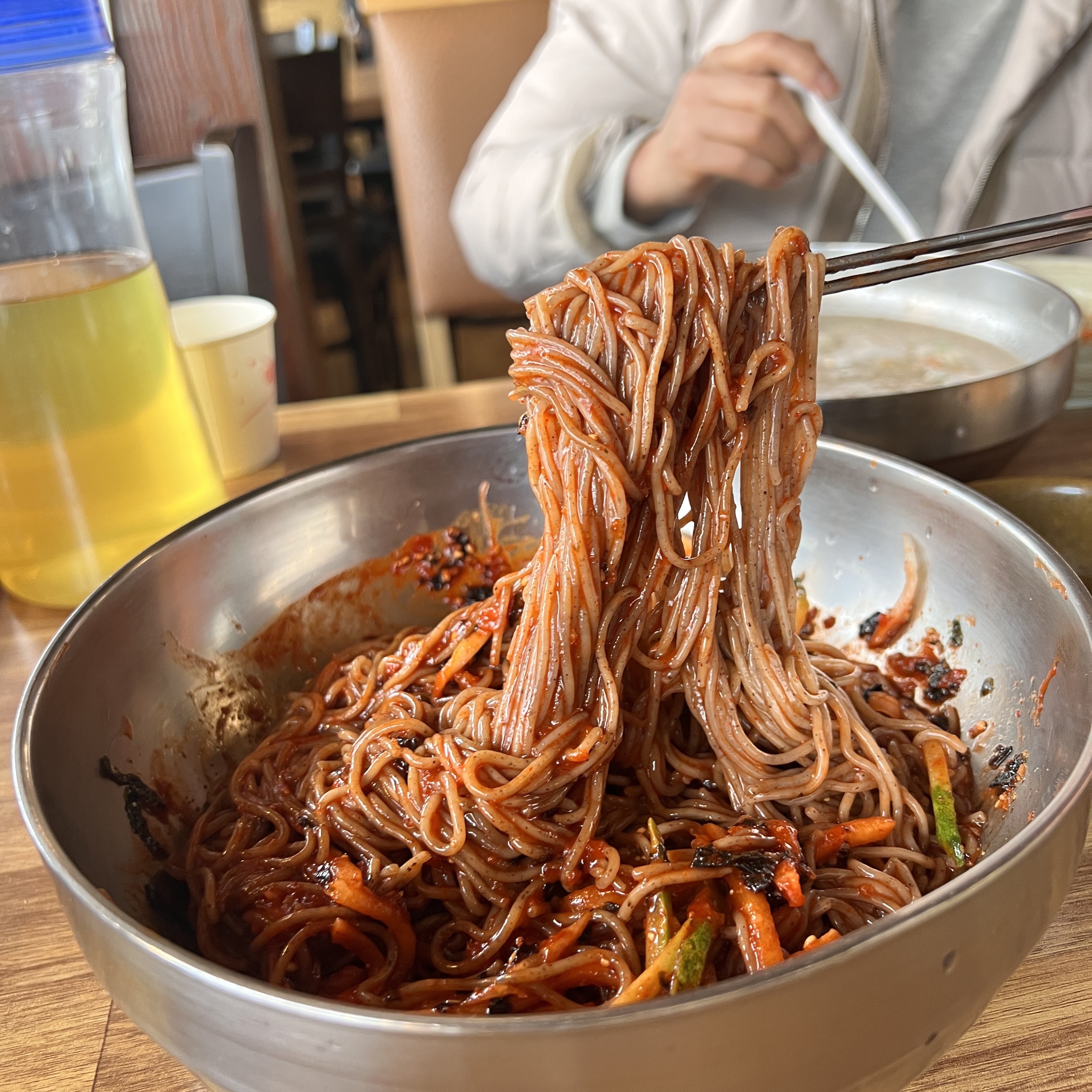 막국수는 역시나 새콤달콤한 양념이 매력적이었습니다. 메밀 비빔국수는 윤기 도는 양념장에 탱글탱글한 메밀면이 딱 어우러져 입맛을 사로잡았습니다. 무엇보다 양념이 과하지 않아서 담백하면서도 깔끔했고, 면발도 아주 탱탱해서 씹는 맛이 대단했습니다. 개인적으로 비빔국수 먹고 남은 양념에 조금 육수를 추가해서 마시는 걸 추천합니다. 그럼 새콤하면서도 묵직한 감칠맛이 더 살아난답니다.